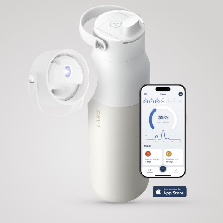 The LARQ PureVis™ 2.0 water bottle is a 680 ml all-in-one self-cleaning and water-filtering bottle with smart hydration tracking. It enhances water quality through a 2-stage filtration and UV-C purification process, delivering cleaner, better-tasting water. The UV-C LED in the cap activates automatically every two hours to keep the bottle clean and odour-free, or you can manually start a PureVis™ cycle at the touch of a button. With a long-lasting battery, the bottle runs for up to 2-3 weeks on a full charge via the USB-C port. The cap features a built-in, detachable soft-touch handle for convenient carrying. Smart sensors track your water intake automatically, while the LARQ app provides insights and progress. Filters should be replaced regularly for optimal performance. Stainless Steel.